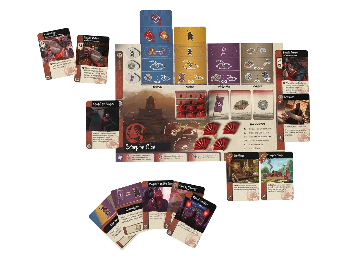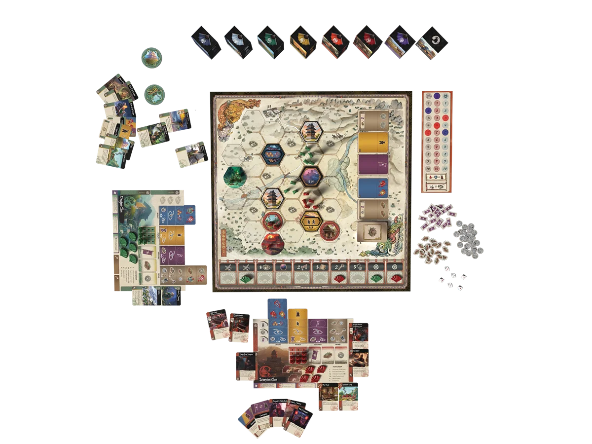 In Tessen: The Battle for Toshi Ranbo, players take on the roles of Rokugan’s illustrious clans to battle and barter their way to victory over the capital city.